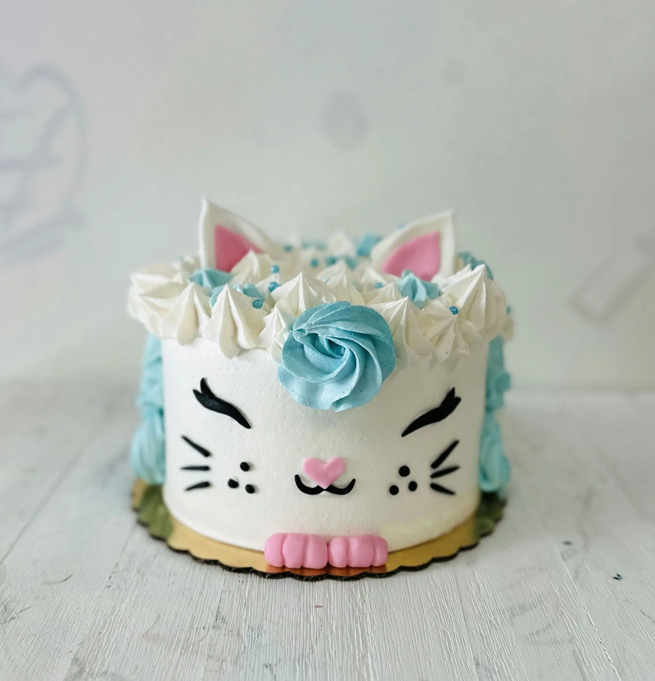 🐾 Decorate a pre-baked cake to look like a cute cat using buttercream and fondant.