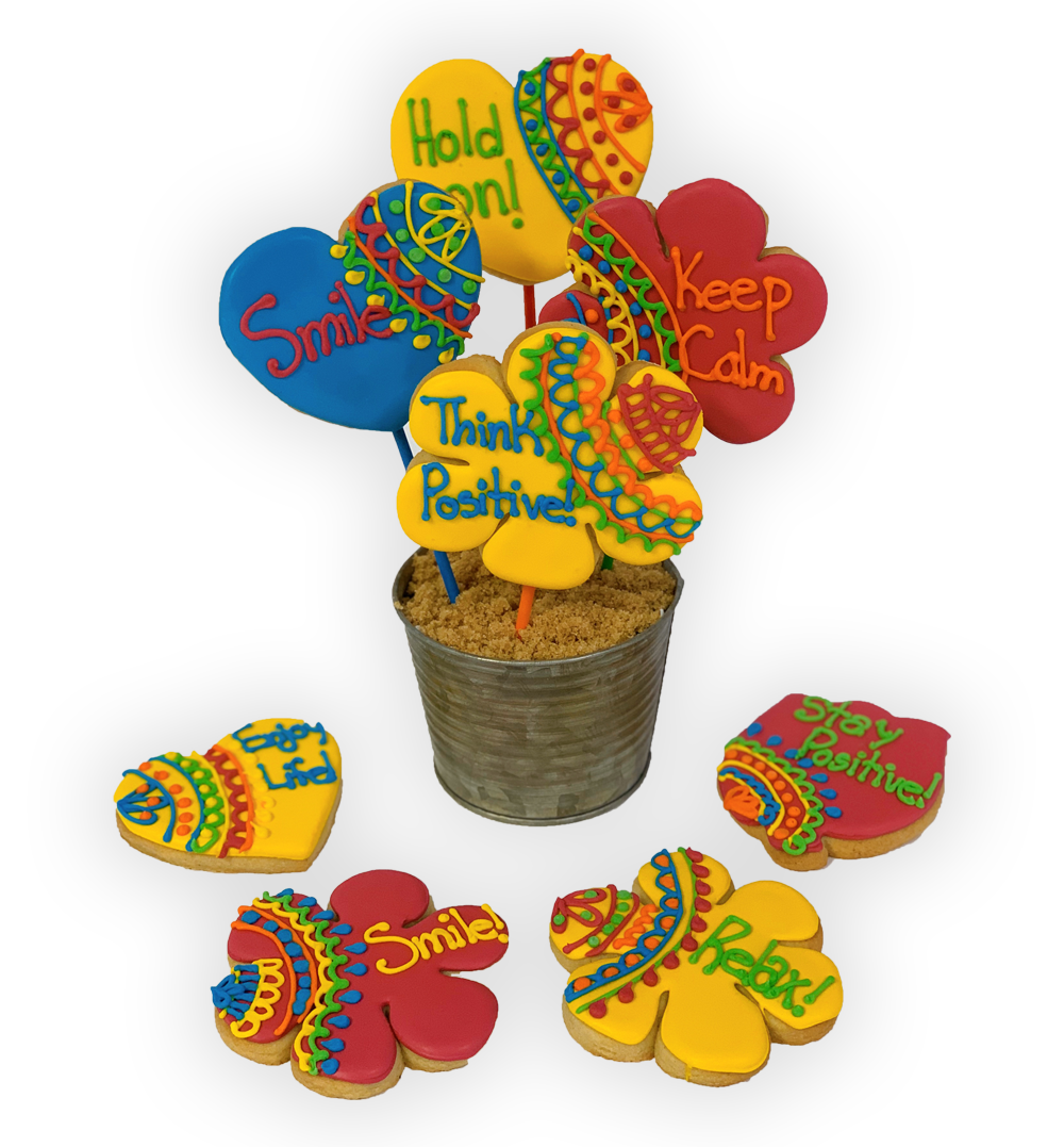 Scratch-made, hand-decorated sugar cookies bear messages meant to encourage, and to lift spirits*. ‘Cookie pops’ are individually wrapped, and arranged in a reusable container*. *Colors, designs, messages, and container may vary. We’ll do our best to accommodate special requests.